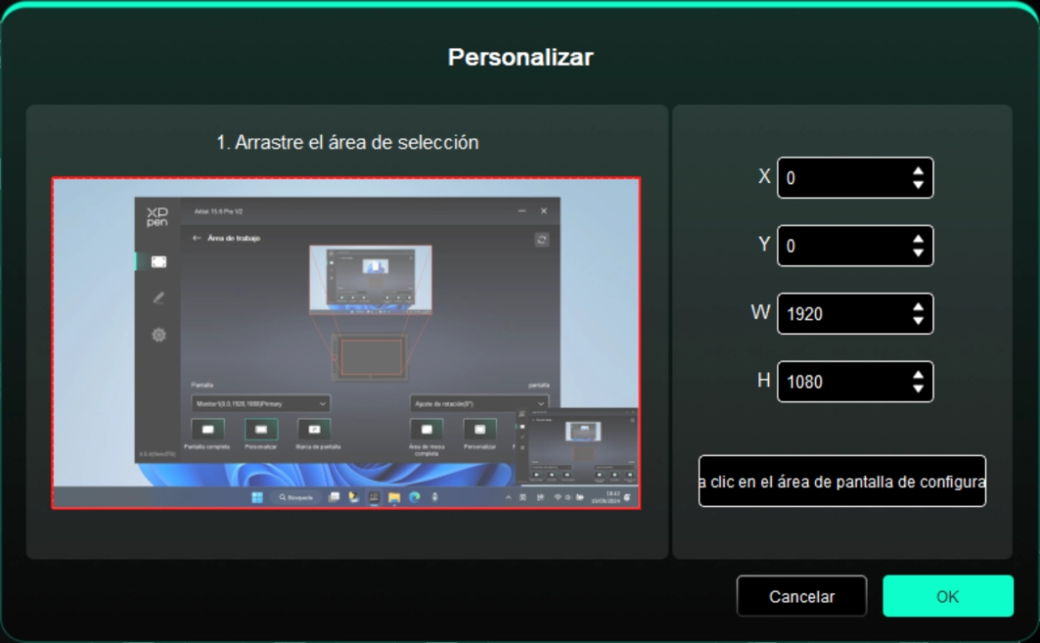 Hacer clic para configurar el área activa: Use el lápiz para hacer clic en la posición de la esquina superior izquierda y la posición de la esquina inferior derecha en su dispositivo.