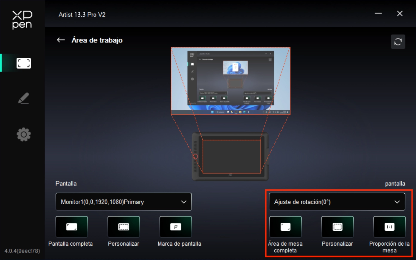 Defina la asignación entre el área de trabajo del dispositivo y el área de visualización de la pantalla.