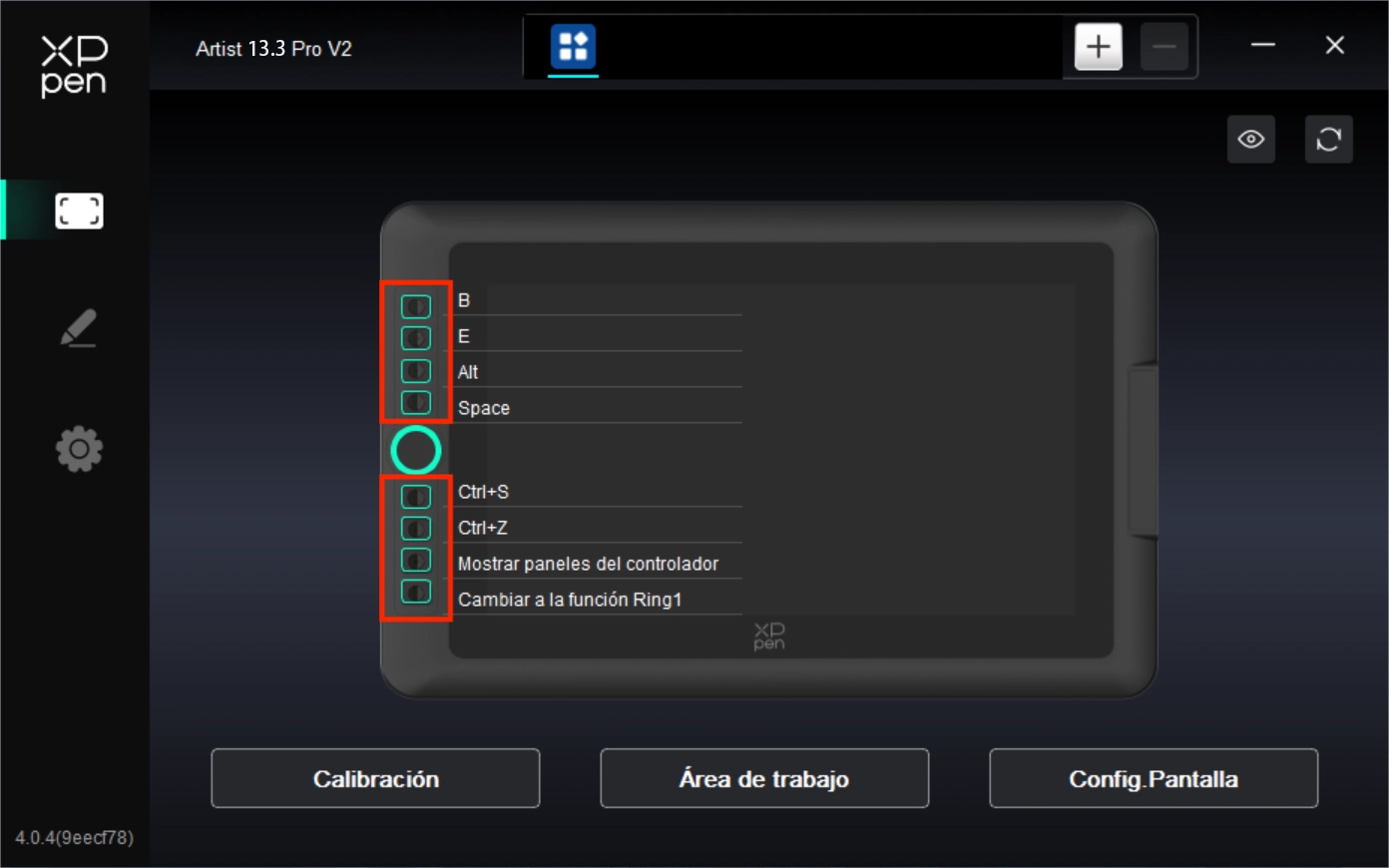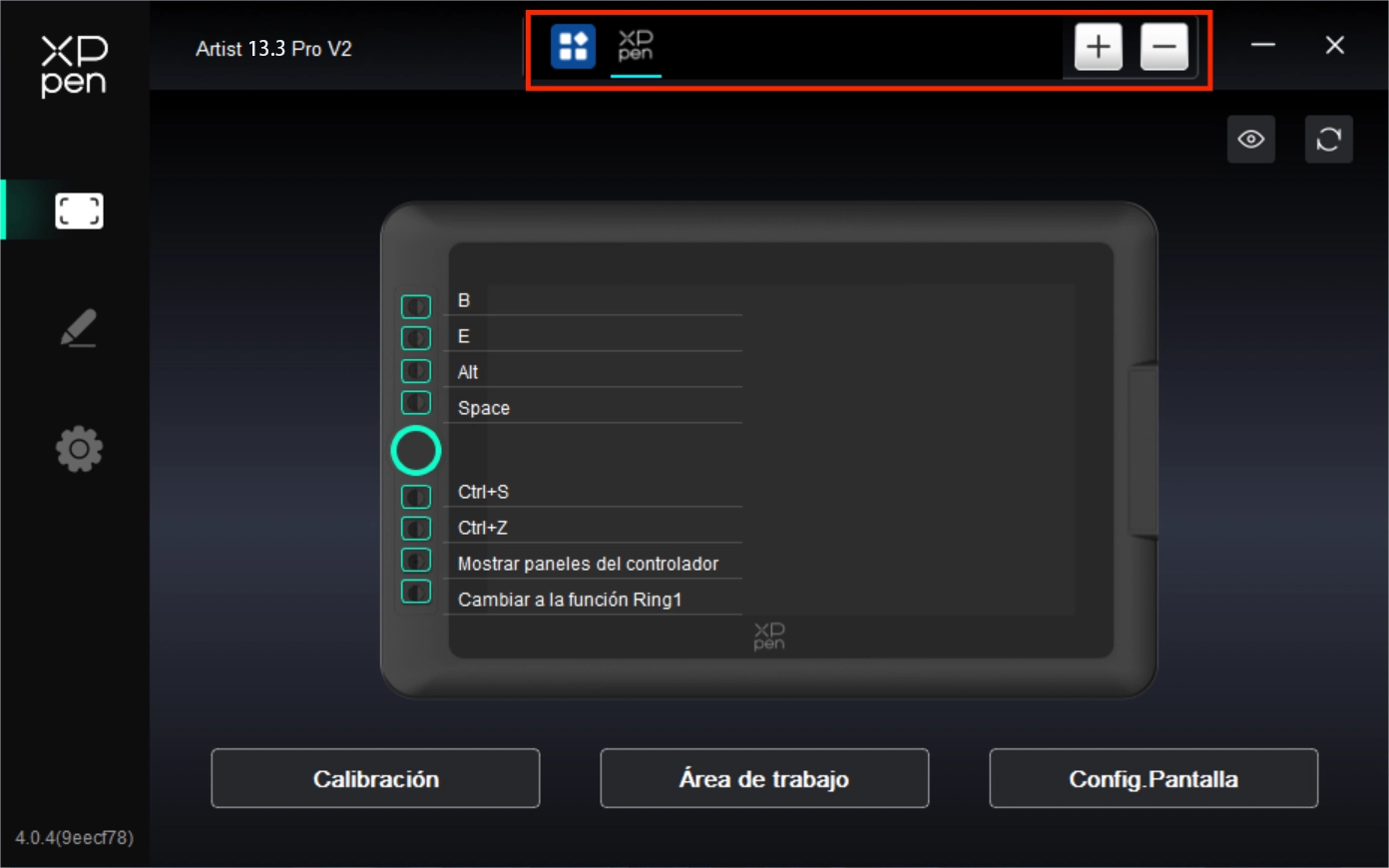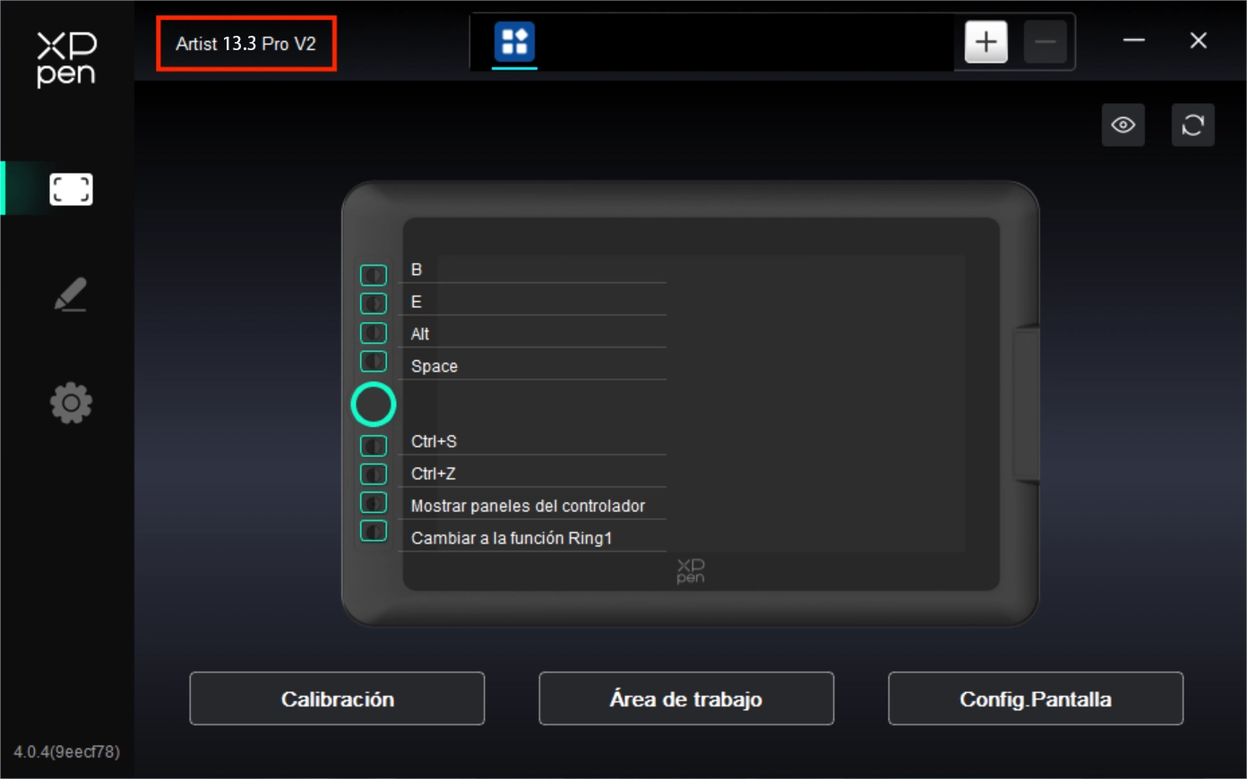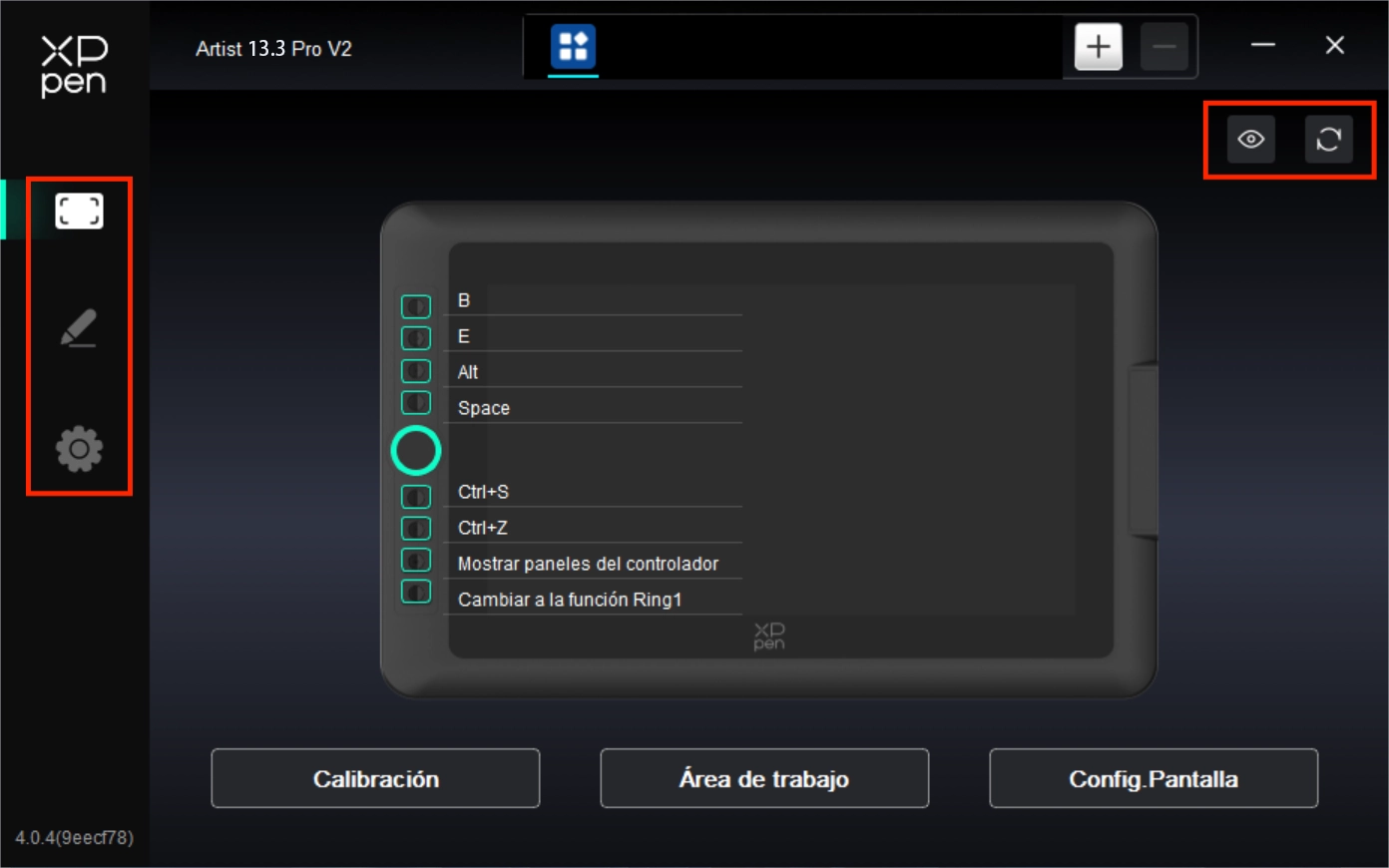 Haga clic en los íconos de la barra de menú a la izquierda para cambiar entre las funciones del controlador. De arriba a abajo, estas son: Configuración del Dispositivo, Ajustes del Lápiz y Configuración del Controlador.
