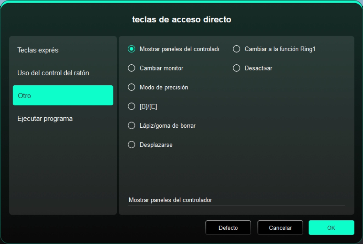Marque una de las aplicaciones, luego podrá personalizar su funciones de tecla exprés, la rueda de desplazamiento y las teclas del lápiz. El cambio solo es válido cuando utiliza la aplicación. Al cambiar entre diferentes aplicaciones, el controlador reconocerá automáticamente y cambiará a la configuración correspondiente.