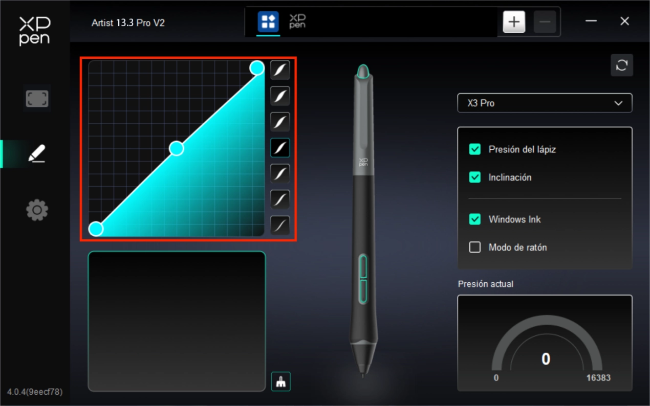 Puede ajustar la presión manualmente ajustando la Curva de Presión o haciendo clic en Opciones de Presión Predefinidas en la columna derecha.