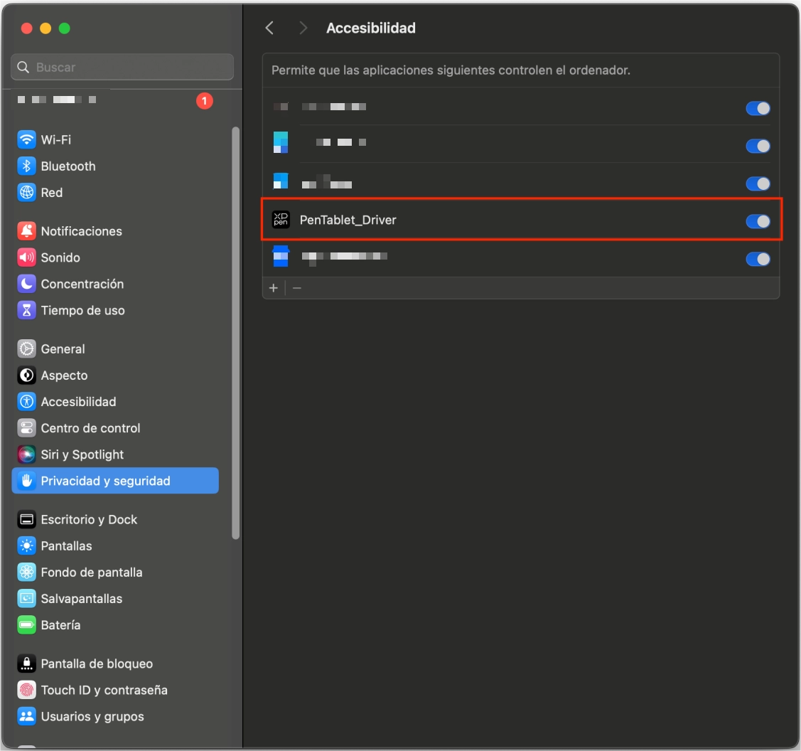 Descomprima el archivo, ejecute el archivo "pkg" y siga las instrucciones para completar la instalación. Vaya a Configuración del Sistema -> Privacidad y Seguridad -> Accesibilidad, asegúrese de que la opción PenTabletDriver esté marcada; De lo contrario, es posible que el dispositivo y el controlador no funcionen correctamente.